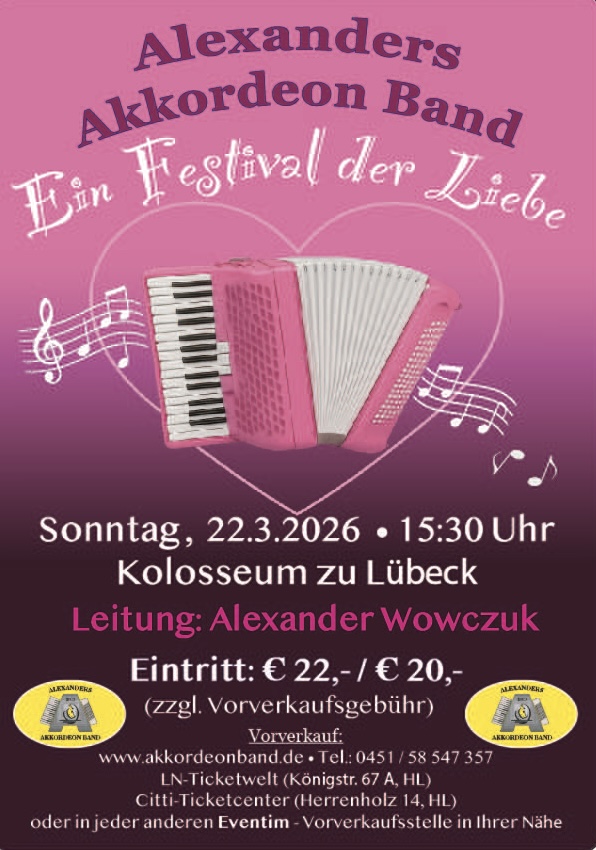 am Sonntag, den 22.03.2026 um 15:30 Uhr findet wieder ein großes Akkordeonkonzert im Kolosseum zu Lübeck statt.